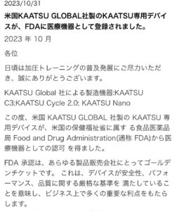 当サロンで使っている、米国 KAATSU GLOBAL 社製の KAATSU 専用デバイスが、米国の保健福祉省に属す る食品医薬品局 Food and Drug Administration(通称 FDA)から医療機器としての認可 を得ました。