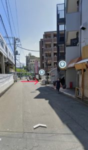 宮前平駅(南口)、高架下付近のパン屋の角を曲がり直進すると右手に『カラオケまねきねこ』の看板がございます。
